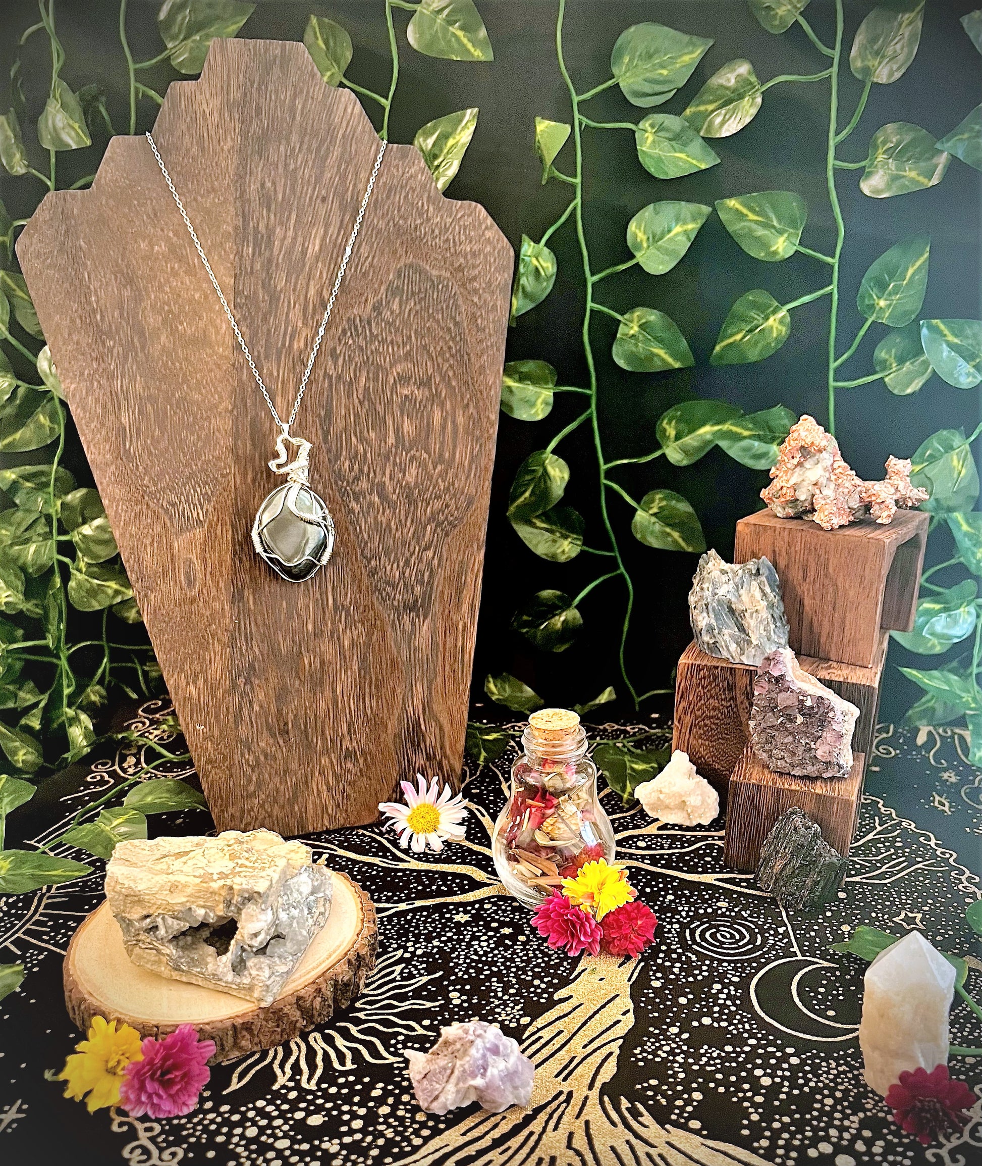 This hematite stone is wrapped in silver plated copper. Hung on a 24-inch, lead and nickel free, silver plated chain. This is an exclusive, handmade, solitary piece!